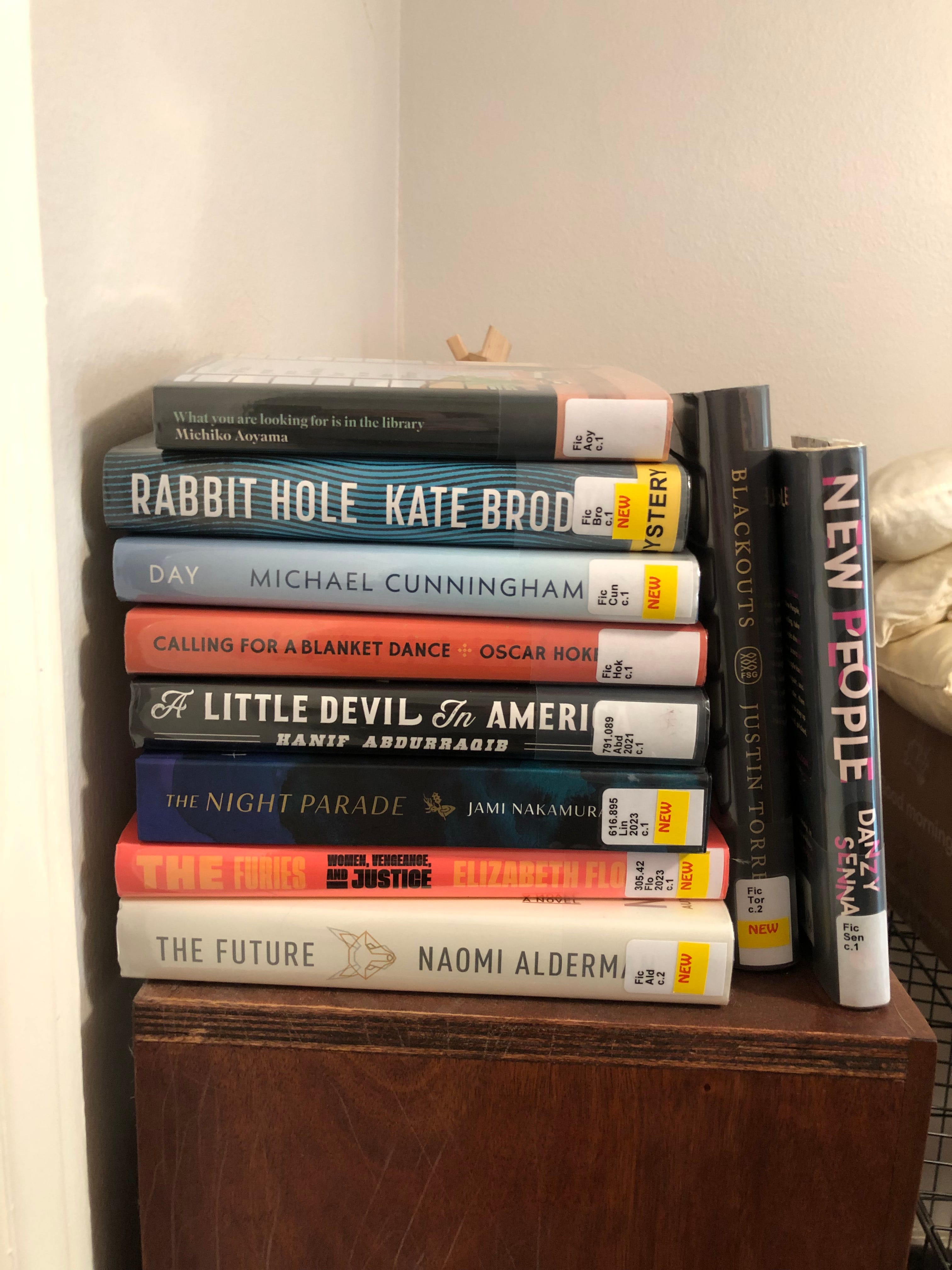As an aside: I once read a personal finance tip to put the cost of a book into savings every time you check a book out of the library, and this tip was not written for poorly compensated power patrons such as myself. For example, this is my current haul of books from the public library. (The books on the side have been read already.) I’d save a lot of money… that I don’t have.